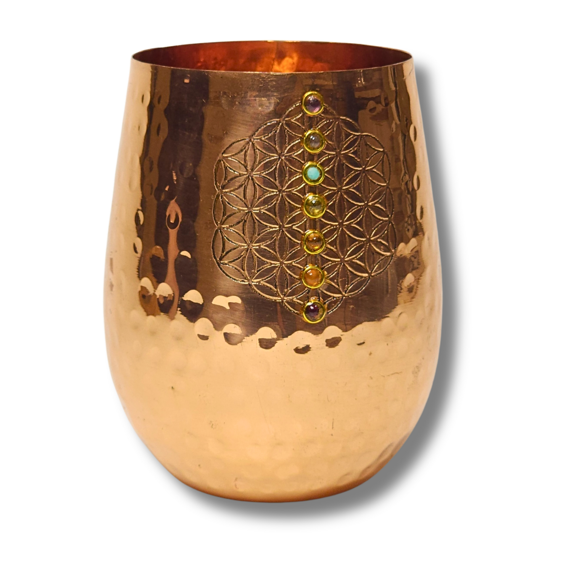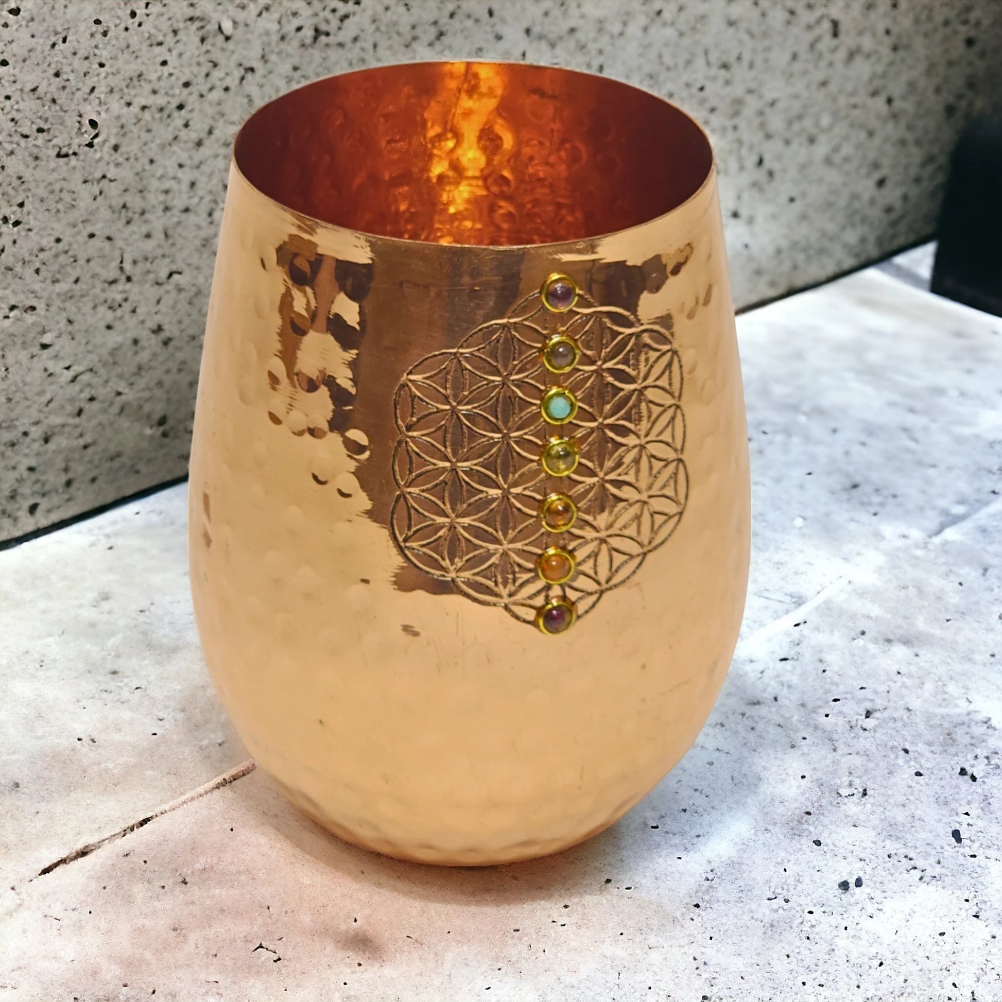 Embrace the beauty and healing properties of our Copper Glass with Flower of Life engraving and chakra gemstones, elevating your drinking experience while nurturing your mind, body, and spirit.
