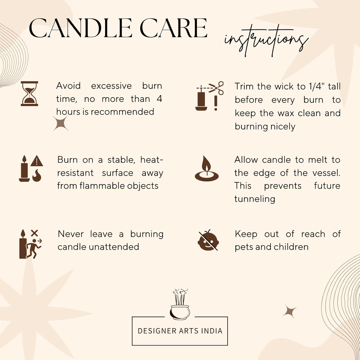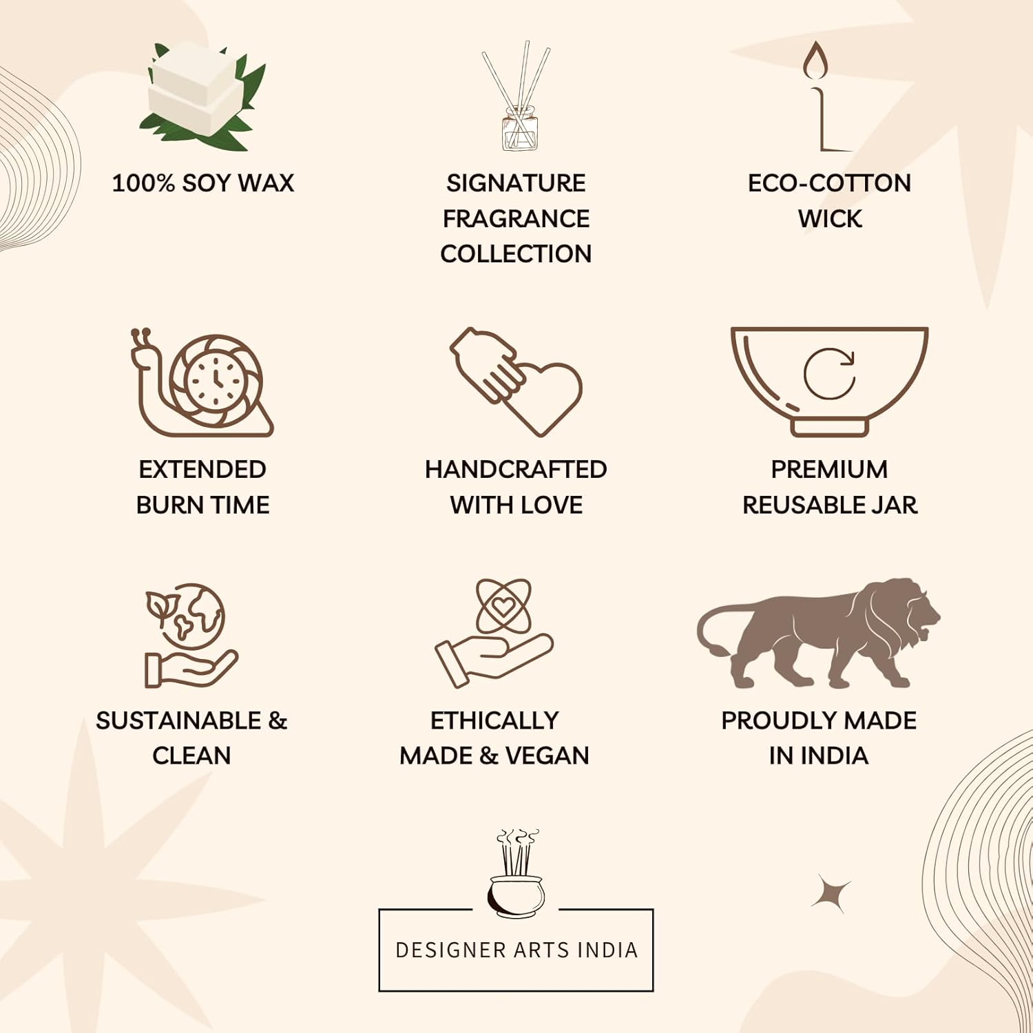 Hand-poured by Indian artisans using 100% natural soy wax for a clean, soot-free burn. Paraffin-free, vegan-friendly, and safe for homes with kids/pets.